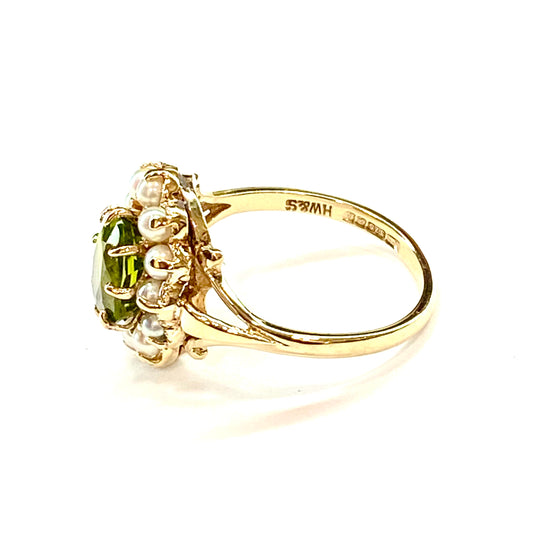 9ct Yellow Gold Peridot and Pearl Cluster Ring Pre Loved