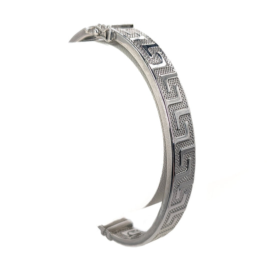 9ct White Gold, Greek Key-Pattern, Flat-Profile, Hinged Bangle
