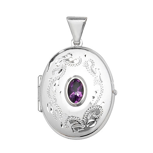 Silver Oval Patterned Locket Set With Gemstone