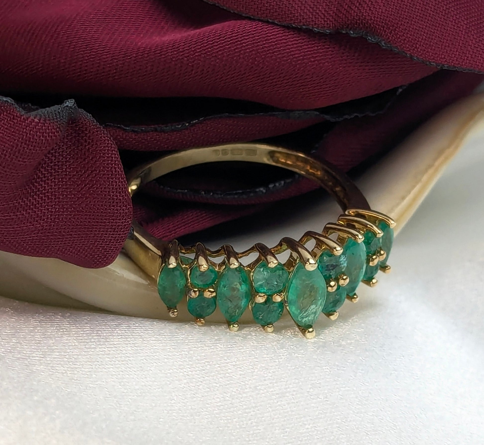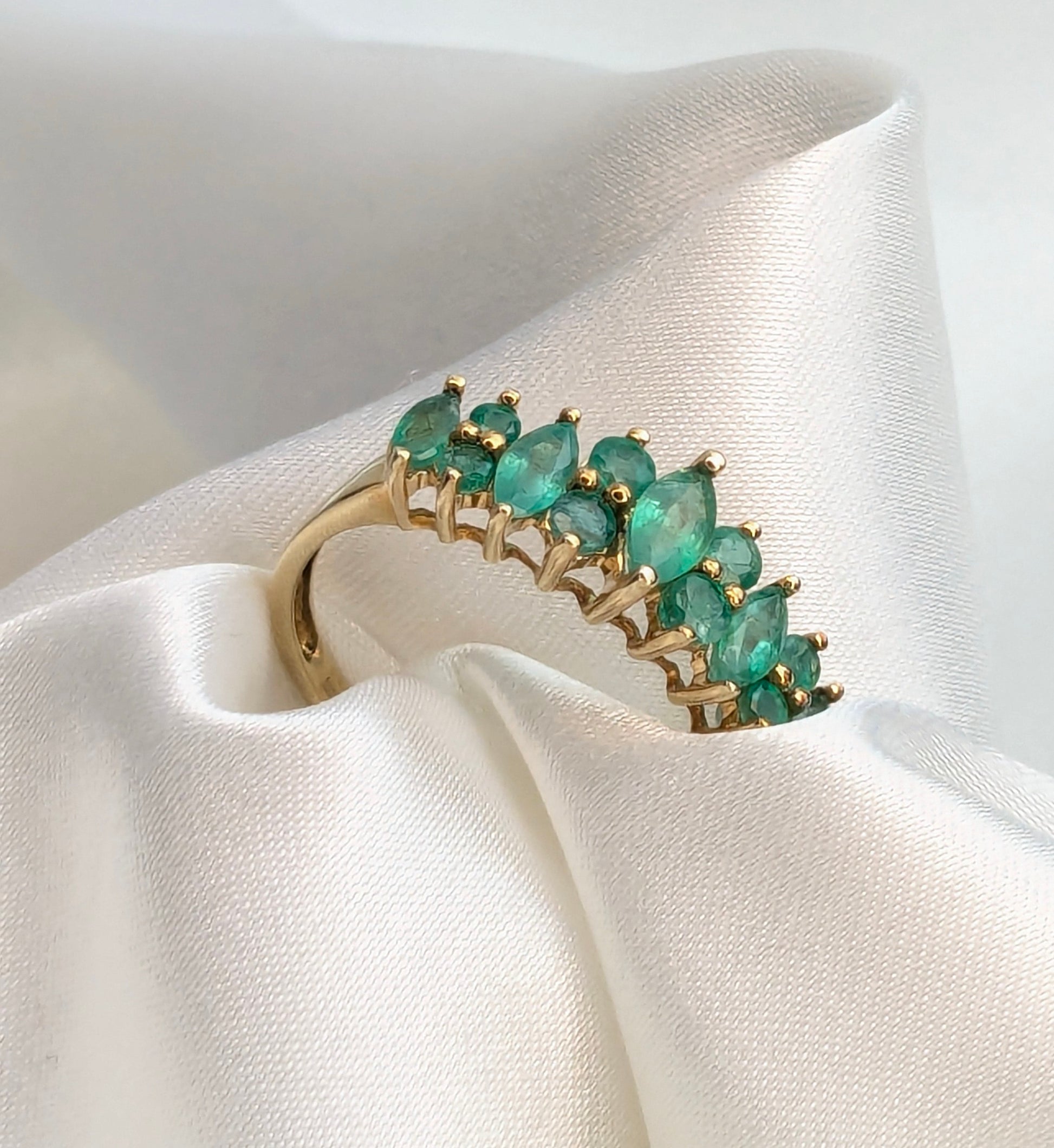 This 9ct Gold Emerald Set Ring features a stunning array of Emeralds, beautifully arranged to enhance its luxurious appeal. The rich green hues of the emeralds contrast elegantly with the warm gold setting, creating a statement piece that exudes sophistication. Perfect for adding a touch of timeless beauty to any collection.