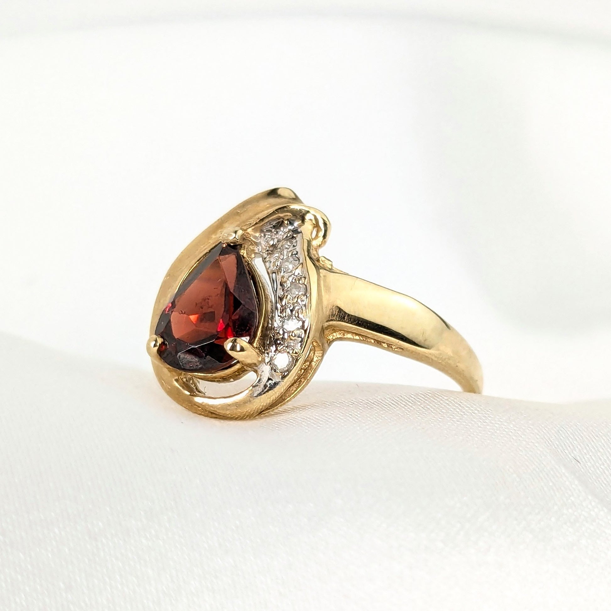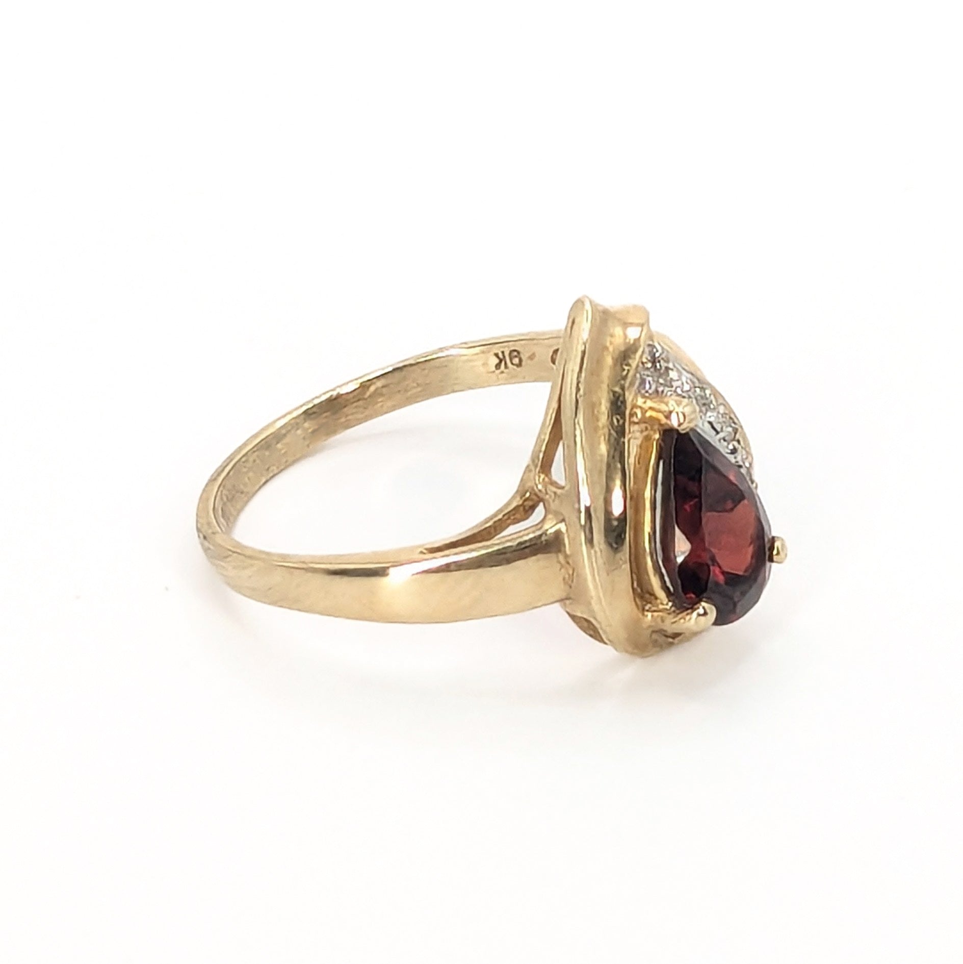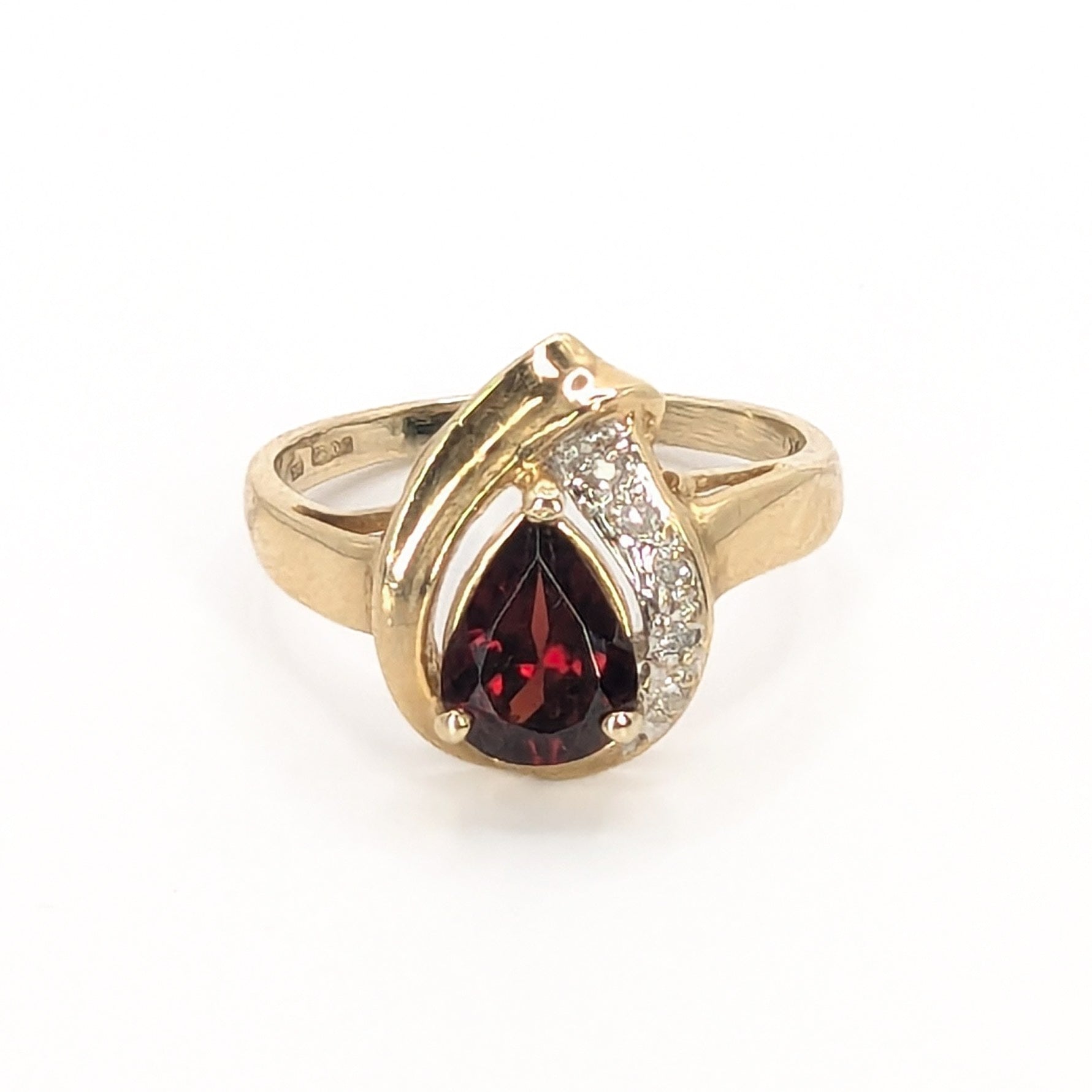 A captivating 9ct Yellow Gold Garnet Ring, featuring a deep red pear-cut garnet, elegantly embraced by a sweeping wave of warm yellow gold. A delicate row of sparkling diamonds enhances the design, adding brilliance and contrast to this timeless piece. With its rich hues and graceful curves, this ring makes a perfect statement of sophistication and elegance.