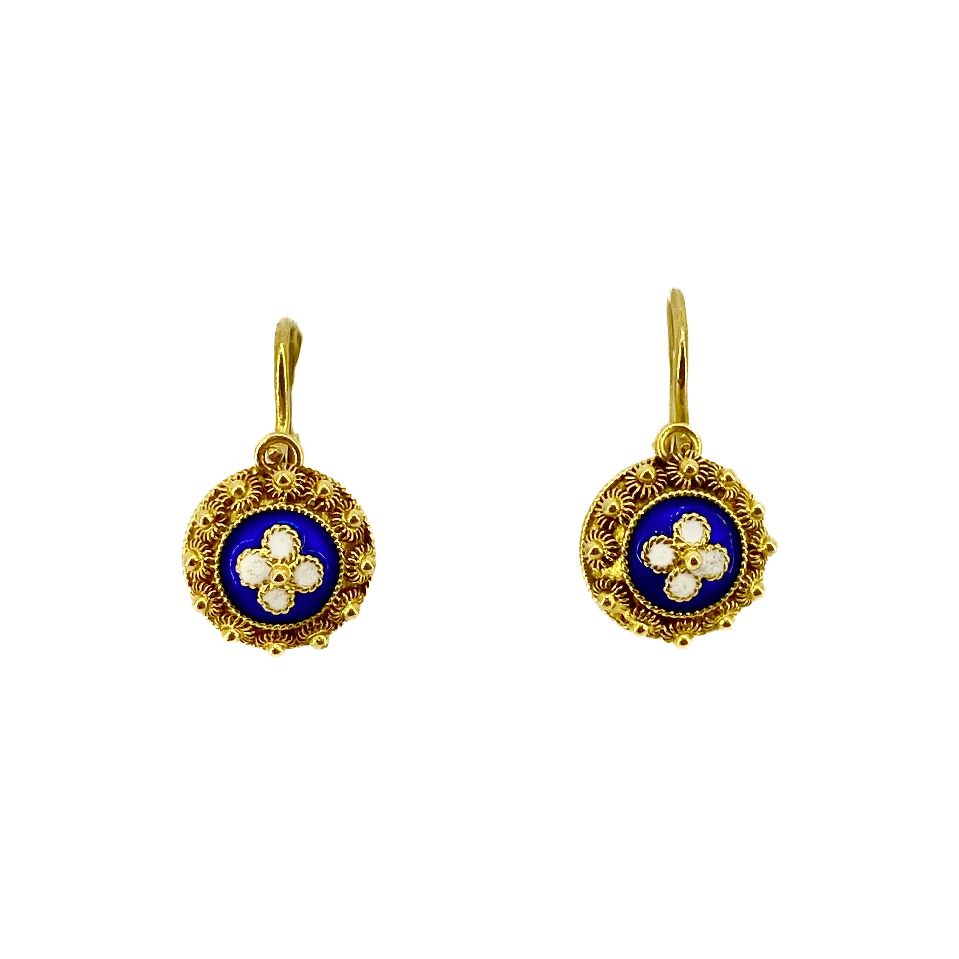 Yellow Gold Blue Enamel European Style Drop Earrings Pre Loved