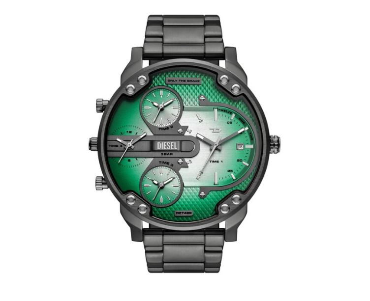 Diesel's 54mm Mr. Daddy New Slim Design watch features a green and white dial, multi-time-zone and a gunmetal stainless steel bracelet.