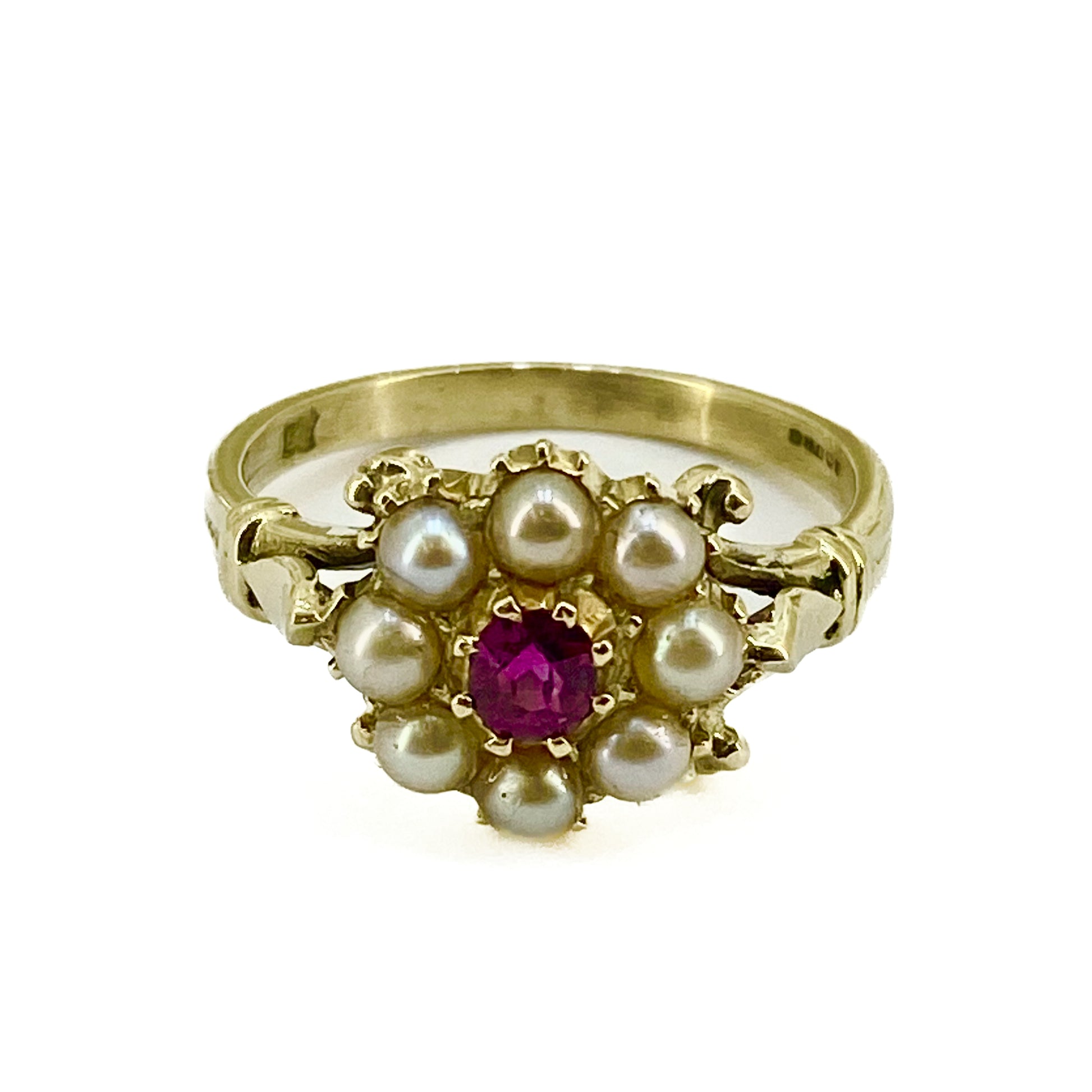 9ct Y/G Pearl & Ruby Cluster Ring Preloved
